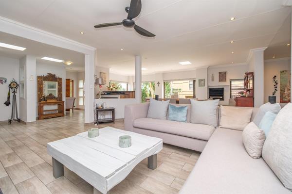 Upon entering through the front door, youre greeted by a spacious open-plan living area that flows seamlessly between a large lounge, a stylish bar, and two distinct dining spaces, perfect for entertaining or relaxed family living. The kitchen is a standout feature, finished in crisp white cabinetry with granite countertops, a pantry cupboard, and a separate scullery with space for three appliances. Ample cupboard space ensures everything has its place.