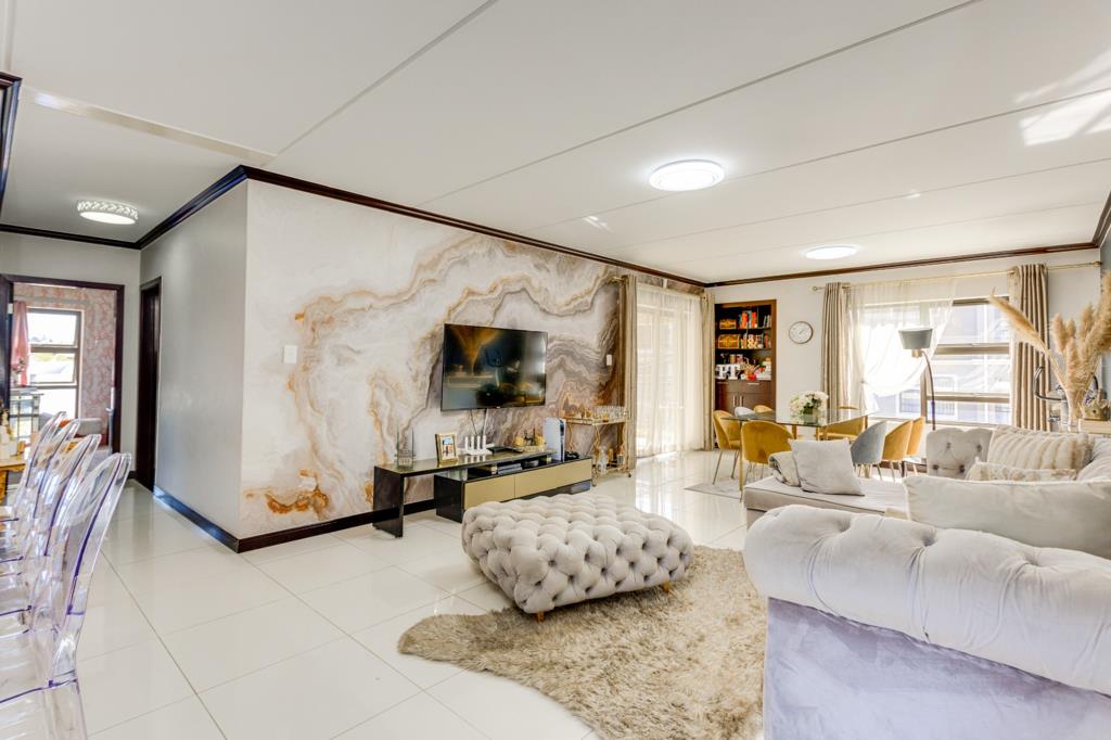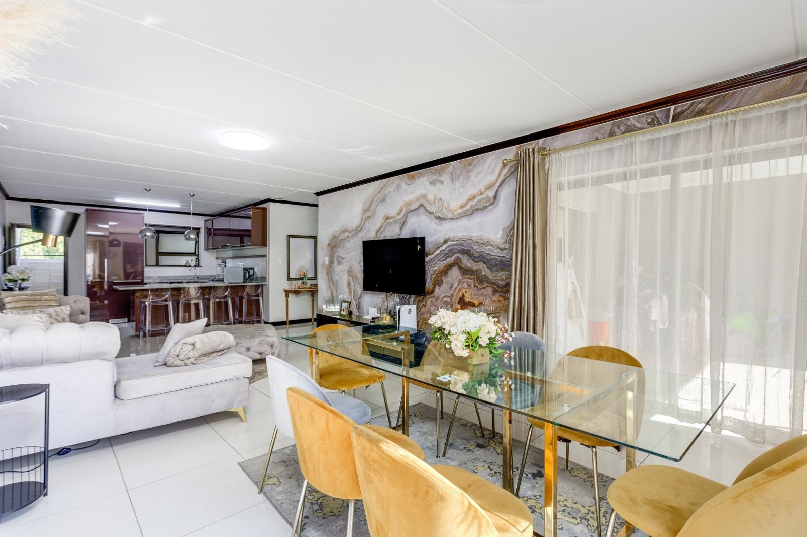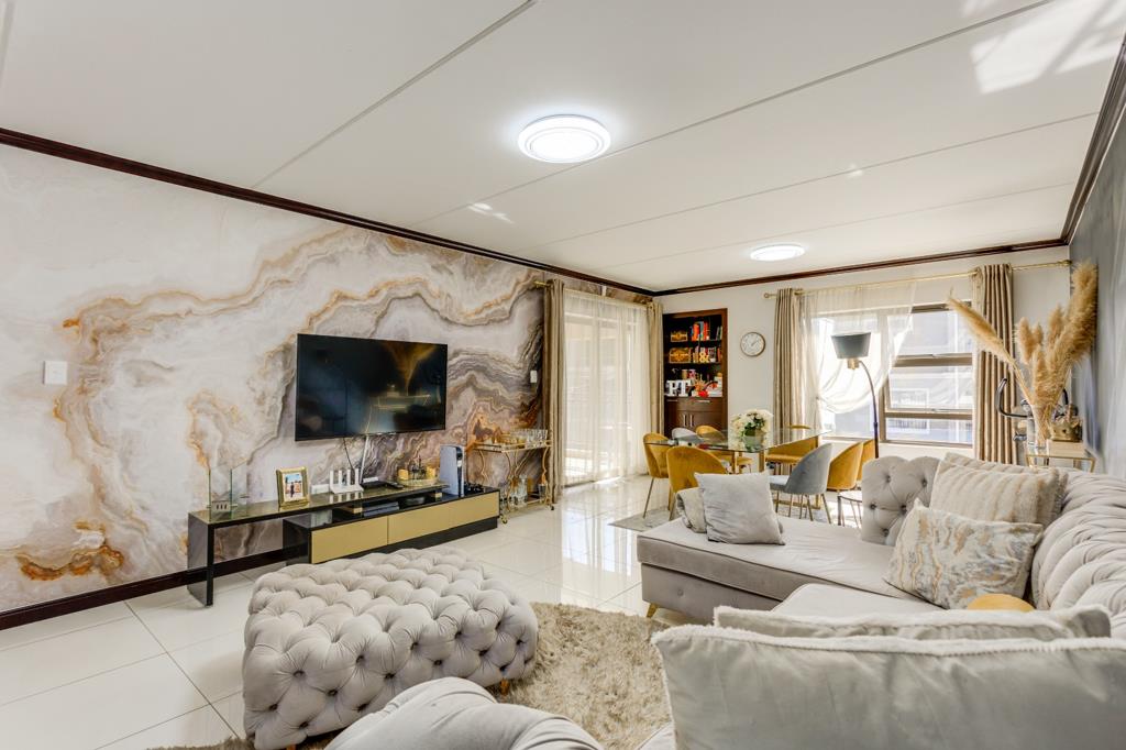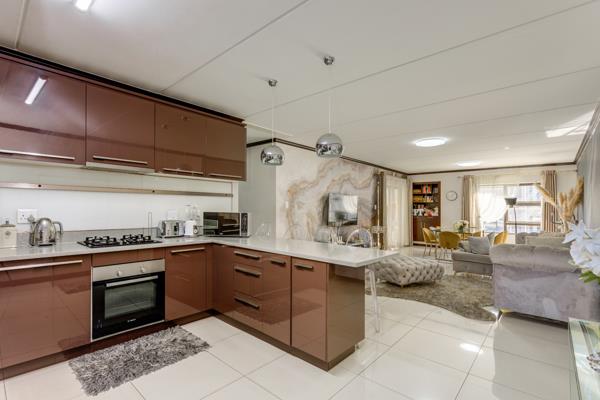 Discover modern living in this stylish 3-bedroom, 2-bathroom residence located within a desirable estate in Kengies, Sandton. This home boasts a contemporary open-plan design, seamlessly connecting the lounge, dining area, and kitchen. The living spaces are illuminated by abundant natural light streaming through large windows and sliding doors, complemented by a striking marble-effect feature wall that adds a touch of luxury. The modern kitchen is a highlight, featuring sleek high-gloss brown cabinetry, a spacious kitchen island perfect for casual dining or entertaining, and clean white tiled flooring throughout.