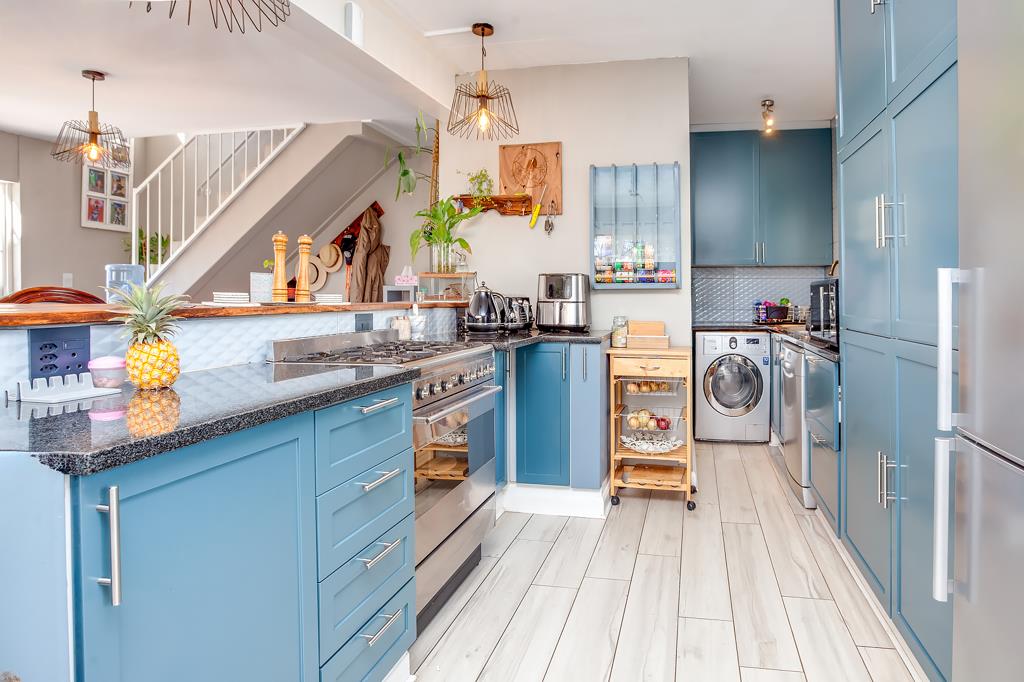 The modern kitchen is a chefs delight, offering ample space and top-tier finishes. Upstairs, the parquet flooring adds a touch of warmth and sophistication, while the main bedroom features customized built-in cupboards for both him and her.