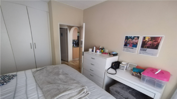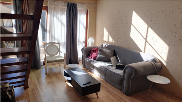 The apartment welcomes you with a warm, open-plan lounge that flows effortlessly onto a private balconyan ideal setting for morning coffee or relaxed evenings. A staircase leads to a generously sized loft area, complete with its own balcony, perfect for use as a home office, creative space, or an open-plan second bedroom. The well-appointed kitchen includes a breakfast nook, oven and hob, and a dedicated space with plumbing for a washing machine. A modern, fully tiled bathroom offers both a bath and shower, blending style with everyday practicality. The master bedroom features laminated wooden flooring and built-in cupboards, offering both comfort and efficient storage.