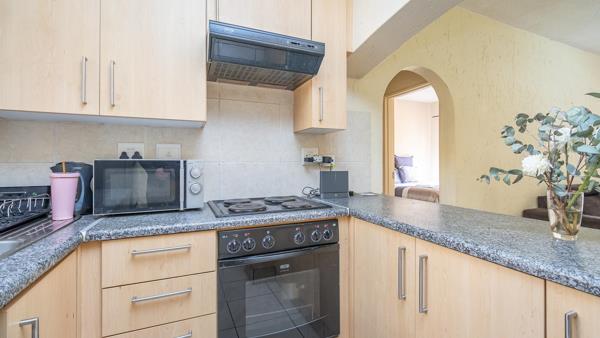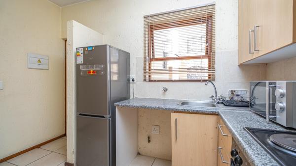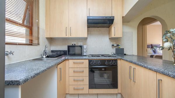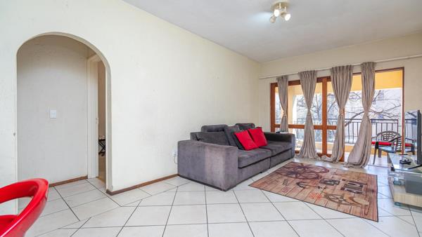 Open plan kitchen, tiled lounge with sliding door leading to spacious balcony.