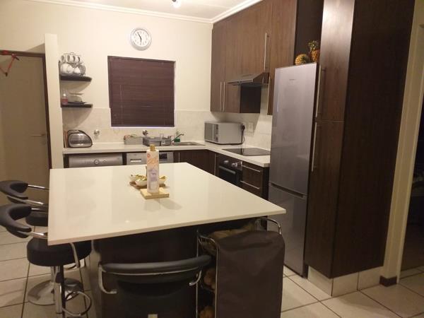 One of the best garden units in Sunet Blvd complex. A stunning 2 bedroom ground floor with an amazing garden. Paved courtyard perfect for braai and relaxing. Apartment has place for two under counter appliances. Newly installed island with cupboards and bin drawer. Ceaser stone counter tops. New Bosch Glass top Stove, oven and extractor. Two bedrooms have laminated flooring with ample cupboard space.