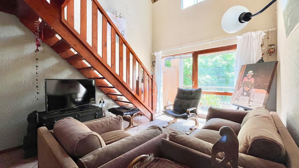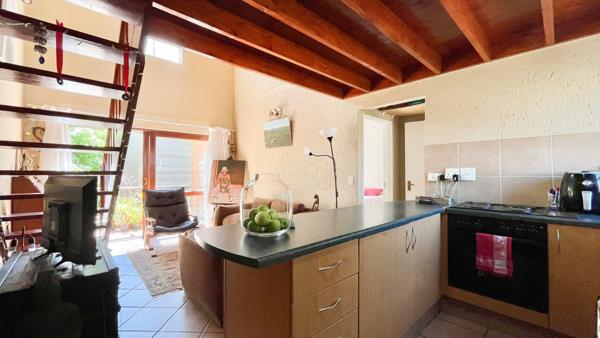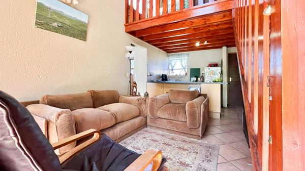 Discover this charming 66 sqm loft apartment, offering a unique blend of rustic character and comfortable living in Lonehill, Sandton. The open-plan living area is a highlight, featuring impressive double-volume and vaulted ceilings adorned with exposed wooden beams that create an airy, spacious atmosphere. Large windows and glass doors flood the space with natural light, enhancing the connection to the outdoors. A prominent wooden staircase serves as a central feature, leading to the upper loft level. The integrated kitchenette, though compact, is highly functional, complete with a convenient bar counter, perfect for casual dining or entertaining. Durable tiled flooring flows throughout the main living spaces, ensuring practicality and ease of maintenance.