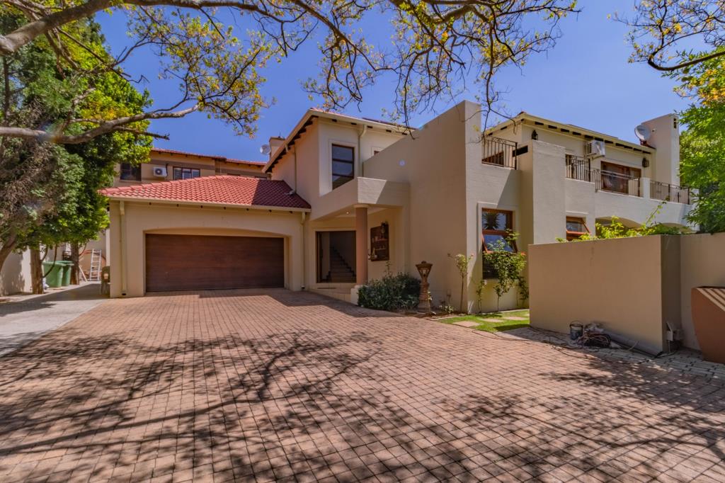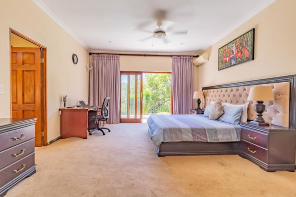 Upstairs, three generous bedrooms open to a balcony overlooking manicured gardens and the nine-metre pool to beat the Joburg summer heat. The master suite is its own retreat, with a full bathroom, walk-in closet, and tranquil views across the estate park.