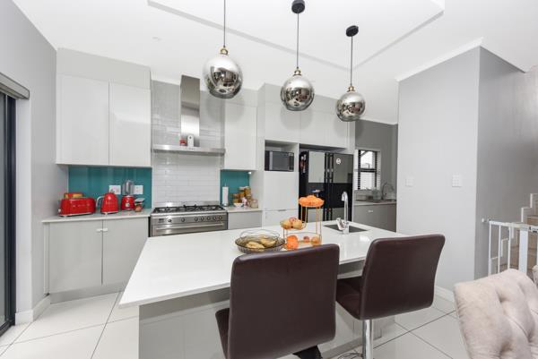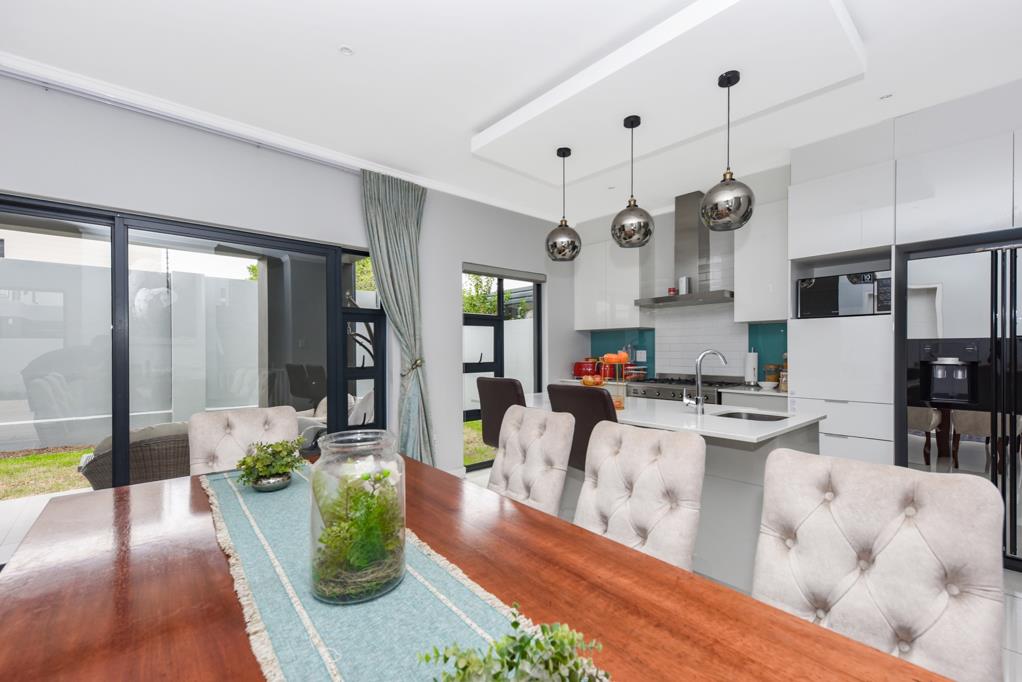 Easy living home offering comfort and luxury. As you step through the front door, you are greeted by a generous sized charming dining room that flows effortlessly from the kitchen. The kitchen is a chefs delight, showcasing modern finishes that elevate its functionality and style. It boasts elegant Caesarstone countertops, a cozy breakfast nook, a convenient prep sink and a stand alone smeg 6 gas burner hob and oven, ideal for culinary enthusiasts. Theres also ample space for a double-door fridge, ensuring you have everything you need at your fingertips. Additionally, the scullery enhances practicality with its double sink and provisions for two under-counter appliances, making meal prep and cleanup a breeze.