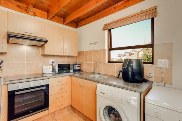 The open-plan kitchen and living area flow seamlessly onto a bright and breezy balcony perfect for morning coffee or relaxed sundowners. The kitchen features a convenient breakfast nook and space for an under-counter appliance.