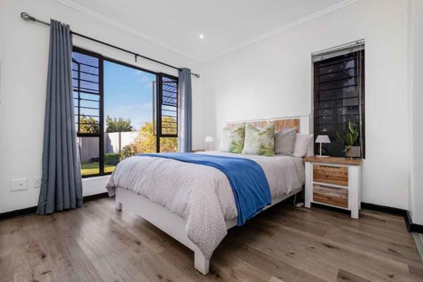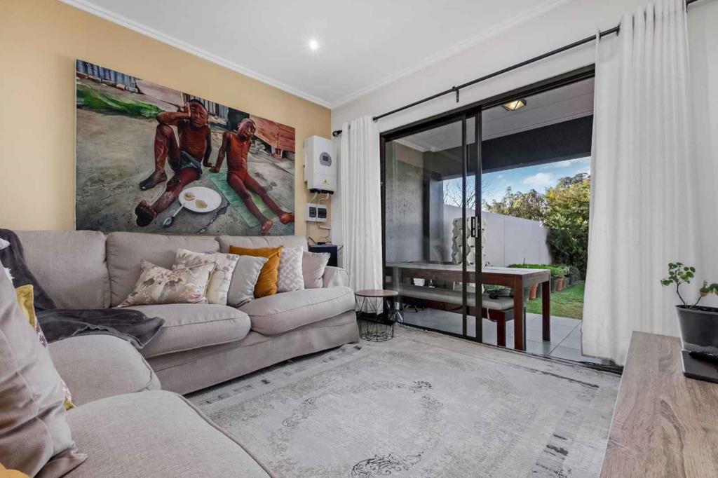 Delightful open plan lounge, spilling out onto a covered patio, overlooking a manicured garden. Spacious and modern eat-in kitchen with Caesarstone counter tops, centre-island breakfast bar, floating shelves, under counter space for 2 appliances, single door fridge space plus ample built-in cupboards.