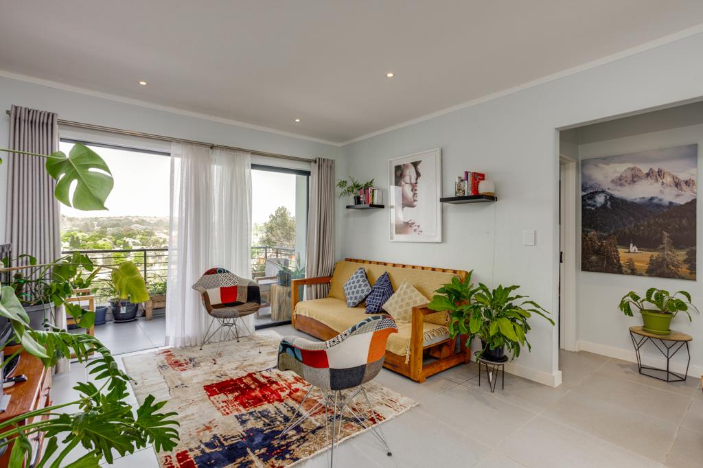 The open-plan kitchen is beautifully designed with modern finishes, including two spaces for undercounter appliances, a gas stove and room for a single fridge. Adjacent to the kitchen is a cozy dining area that seamlessly flows into the living room, which opens out to a balcony showing stunning panoramic views of Johannesburg.