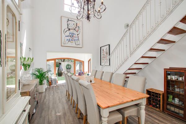 Entertainment and relaxation are further enhanced by two distinct lounge areas, catering to both formal gatherings and more casual, intimate moments. The covered patio extends the living area outdoors, creating an inviting space for al fresco dining or relaxation.