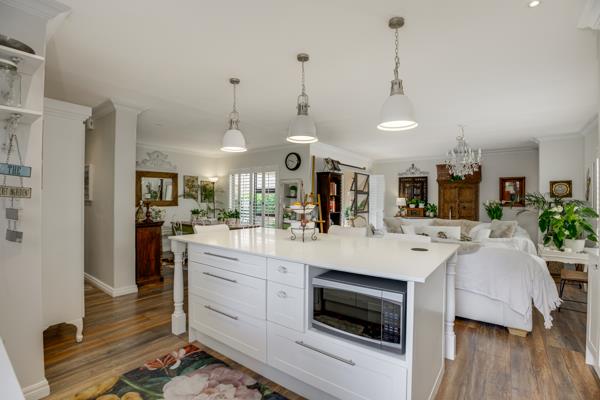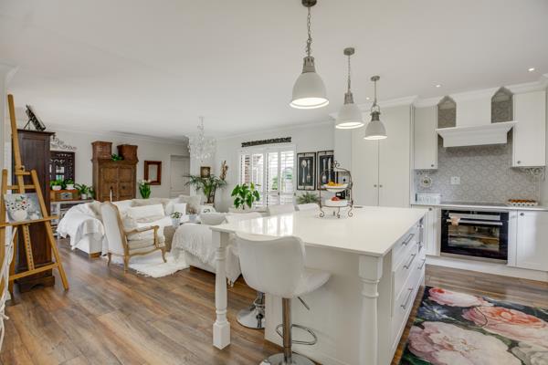 The spacious lounge flows seamlessly onto a large covered patio overlooking a beautifully manicured garden, ideal for relaxing or entertaining. The modern kitchen features a stylish breakfast island, elegant lighting, imported Italian tiles, and premium fittings including a Grundig hob and oven, double sink, ample cabinetry, and dedicated spaces for a fridge, microwave, and dishwasher.