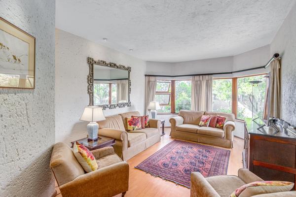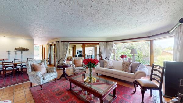 The home flows effortlessly from one space to the next, beginning with a formal sunken lounge featuring a curved window overlooking manicured gardens. Sliding doors open onto a sizable, covered patio that serves as an outdoor retreat, complete with a built-in braai and views of a sparkling pool. Just beyond, an expansive open-plan dining and lounge area includes a bar and cosy fireplace, perfect for winter evenings, with sliding doors that connect seamlessly to the outdoor patio.