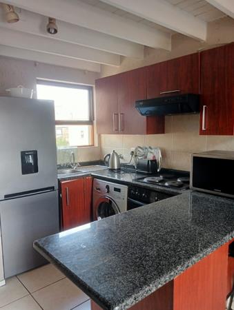 Discover comfortable living in this inviting 2-bedroom, 1-bathroom residence situated within a well-maintained complex in Lonehill, Sandton. The interior boasts a functional layout designed for modern lifestyles, featuring two distinct lounge areas and a dedicated dining room, providing ample space for relaxation and entertaining. The kitchen is a highlight, equipped with modern appliances, sleek cherry wood-toned cabinetry, granite-look countertops, and a convenient breakfast bar. An integrated washing machine and extractor fan enhance its practicality, while natural light streams in from a window above the sink.