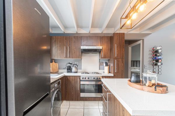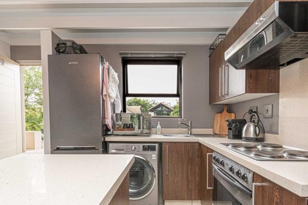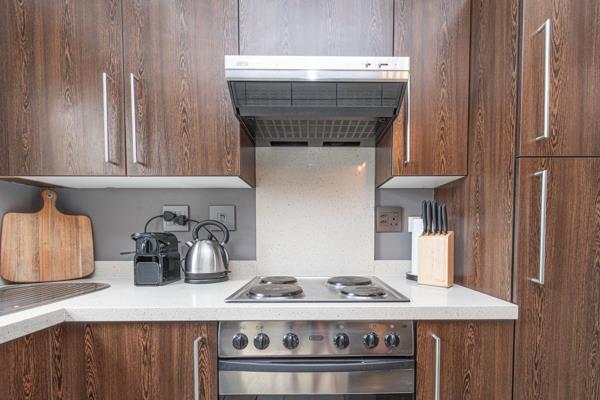 Upon entry, youre welcomed by a contemporary kitchen, beautifully designed with an island that provides additional storage and convenient seating. There is space for a single-door fridge and one under-counter appliance, and the kitchen is completed with an electric stove and oven, complemented by stylish lighting fixtures. The kitchen flows seamlessly into an open-plan, light-filled dining area with double-volume ceilings, creating an impressive sense of space. From here, sliding doors lead out onto a sunny balcony ideal for morning coffee or evening unwinding.