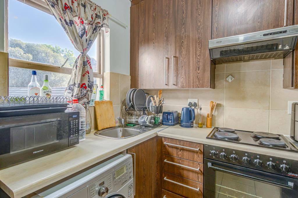 Modern kitchen with granite countertops, electric hob, undercounter oven, extractor fan, and space for one appliance