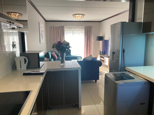 Bright, airy 2-bedroom, ground floor apartment. The spacious bedrooms have good cupboard space with high gloss finishes and added appeal are the recently laminated floors. The bathroom has luxury finishes and consists of a shower, basin, bathtub and toilet. A beautifully tiled open plan lounge and kitchen. In the lounge area is a fitted designated study nook with desk and bookcase.