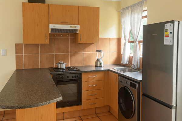 Discover comfortable living in this inviting 77 sqm apartment located within a secure complex in Paulshof, Sandton. The well-appointed kitchen features a practical U-shaped layout, equipped with modern appliances including a fridge, oven, hob, and an integrated washing machine. Light wood cabinetry and dark speckled countertops offer ample storage and preparation space, complemented by a warm-toned tiled backsplash and floor. Adjacent to the kitchen, the spacious lounge provides a welcoming area for relaxation and entertainment.