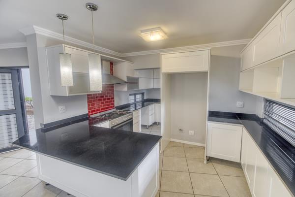 Enjoy a seamless transition from the kitchen to the dining area and living room, which opens through sliding doors adorned with plantation shutters to a covered patio featuring a built-in braai and a beautifully manicured garden. This corner unit offers a particularly private outdoor space.