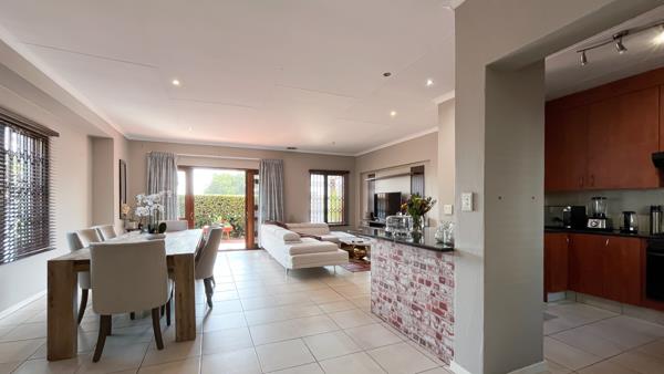 Step into a beautifully maintained, hedged garden featuring terracotta tiling, decorative pebble inlays, and low-maintenance LM grass that gracefully surrounds the home. The expansive, covered patio has been extended with durable Perspex roofing, making it fully weather-resistantideal for year-round entertaining. The tiled patio flows seamlessly into a spacious, open-plan lounge and dining area, enhanced by elegant wooden sliding doors.