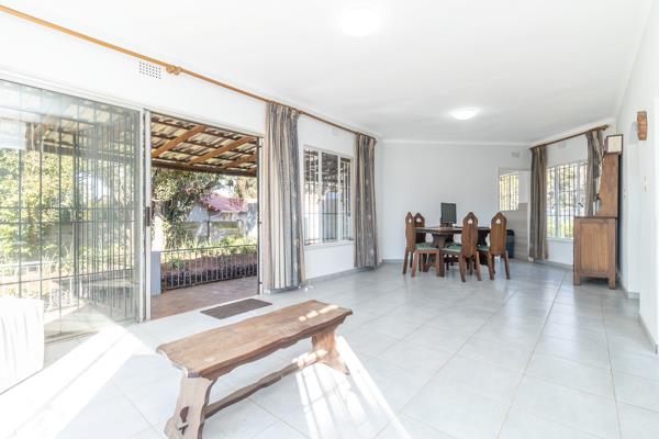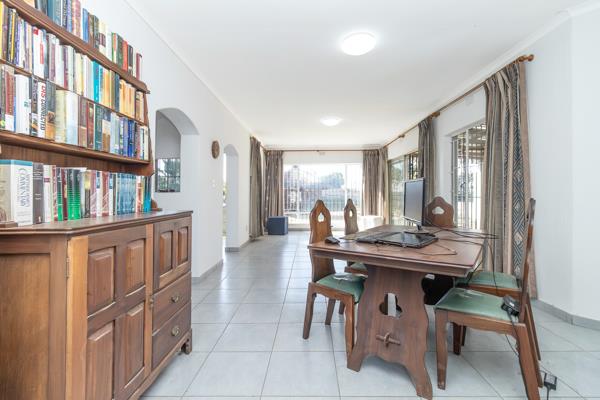 Outdoor Entertainers Dream A covered patio leads to an established garden, sparkling swimming pool, and thatch Lapa, perfect for weekend braais and family gatherings.