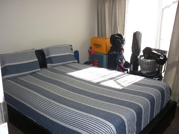 The spacious bedroom features built-in cupboards, while the large bathroom includes both a bathtub and a separate shower.