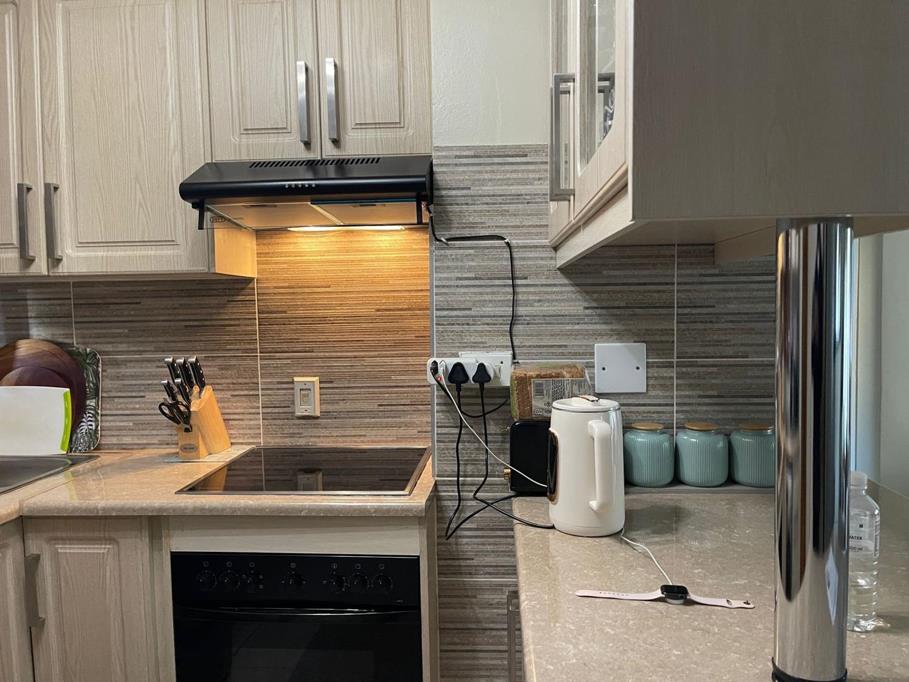 aFunctional kitchen with breakfast counter, space for a double-door fridge and one under-counter appliance