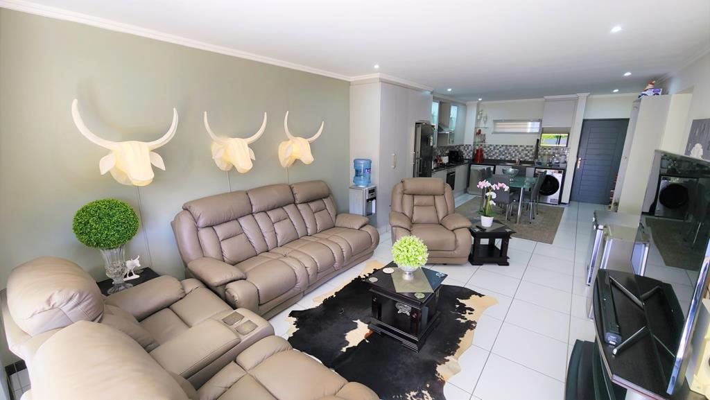 You are welcomed into a large open-plan air-conditioned living area consisting of a sizeable lounge, dining room, and modern kitchen. The open-plan gourmet kitchen offers ample cupboard space, Caesarstone countertops, glass gas hob with extractor, oven, and space for 2 under-counter appliances and fridge, as well as a pantry cupboard. The living area opens out through glass sliding doors to a covered patio area with roll down exterior blinds to enclose the patio to shield from the elements. The patio overlooks an expansive garden with automated irrigation system.