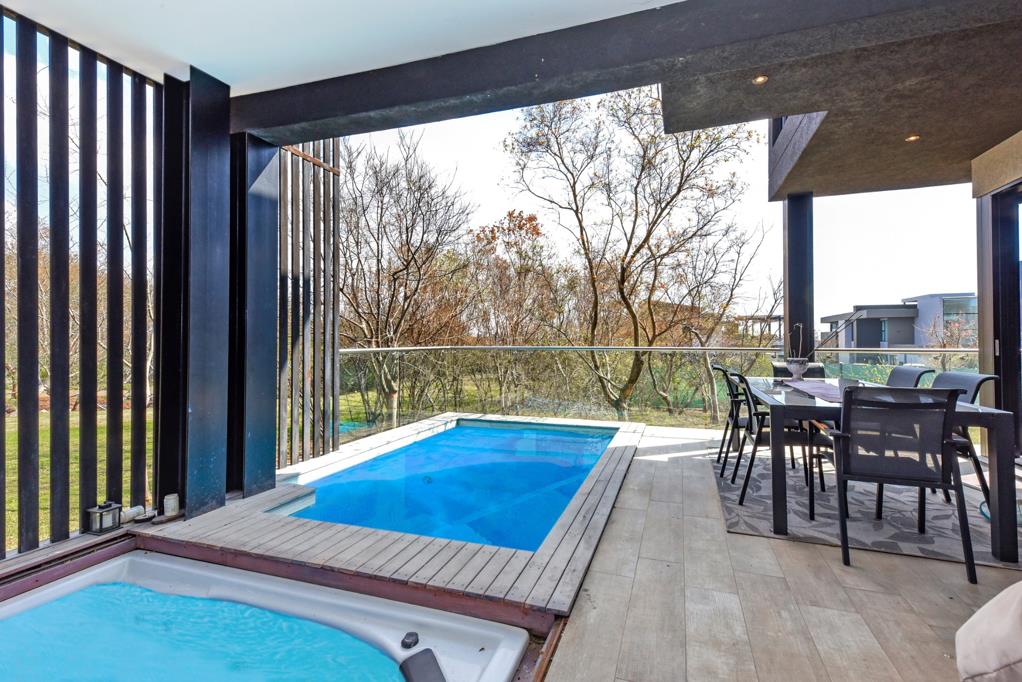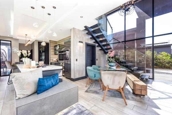 Resort-Style Modern Home in Steyn City. This beautifully designed 3-bedroom, 3-bathroom residence with 3 garages and a private study captures the essence of modern luxury in one of Steyn Citys most sought-after positions. Set on the river and overlooking an expansive greenbelt, the home offers a sense of peace and privacy, surrounded by nature and far removed from the bustle of city life.
