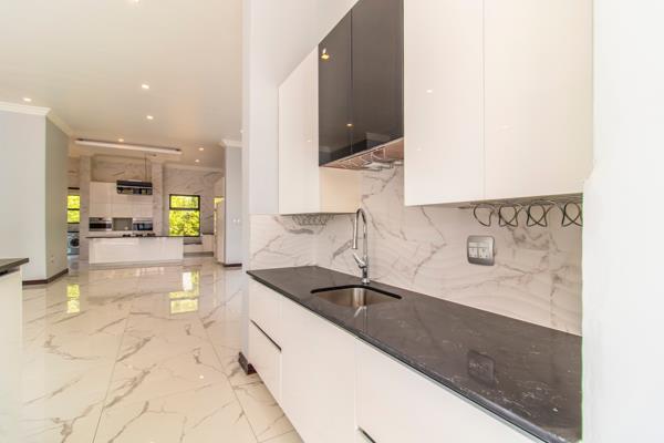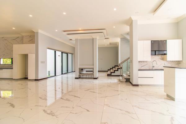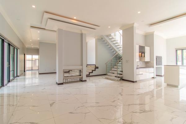 The house features a grand, double-volume foyer, descending into an open-plan living and dining room, which is separated by a double-sided gas fireplace. The master chef kitchen, with integrated Smeg appliances, offers a walk-in pantry and separate scullery / laundry. There is a built-in braai and bar area for the discerning entertainer, which seamlessly flows towards the outdoor patio overlooking the garden and pool. Upstairs boasts a spacious pyjama lounge, with 4 en-suite bedrooms, all with air conditioning, built-in cupboards and private balconies. The upstairs area also features a library / study and a home cinema. An additional guest bedroom is located downstairs, with a private, en-suite bathroom.