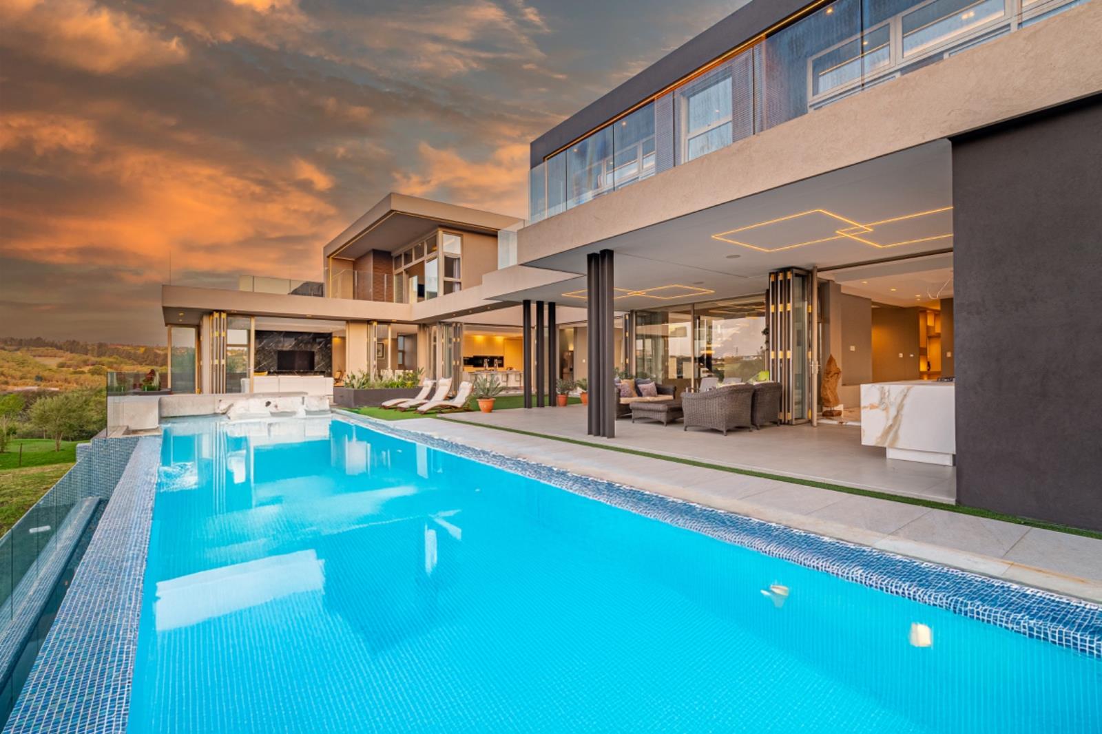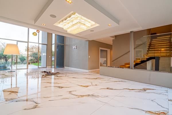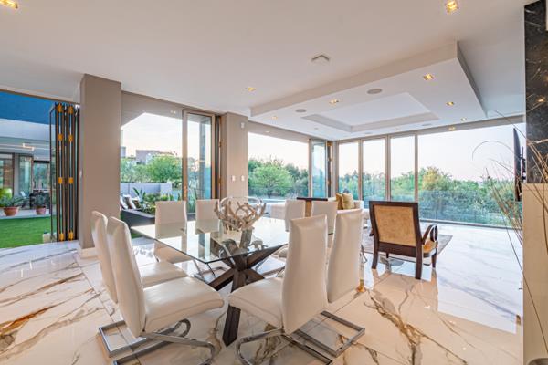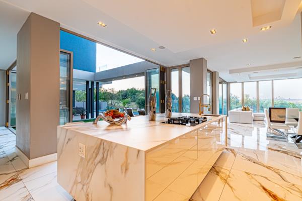 Set in one of the most coveted positions within Steyn City, this architectural masterpiece redefines modern luxury with uninterrupted views of the golf course and iconic Palazzo Steyn. Perfectly positioned alongside the 4th tee box and bordered by a tranquil greenbelt, the home makes a striking first impression with water features and LED-lit accents leading to grand, light-filled interiors. High ceilings, double-glazed stacking doors, and seamless indoor-outdoor flow connect elegant living spaces to multiple entertainment areas, including an infinity pool, firepit lounge, and alfresco kitchen with built-in braai. At its heart lies a state-of-the-art Miele kitchen with integrated appliances and a dazzling chandelier above the dining space, complemented by both formal and informal lounges, each enhanced by feature walls and gas fireplaces.