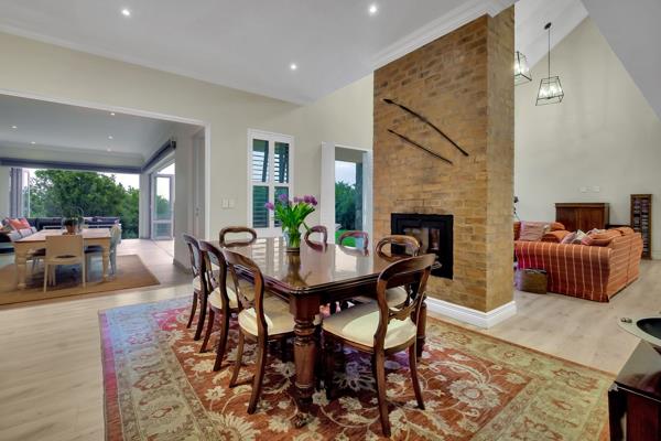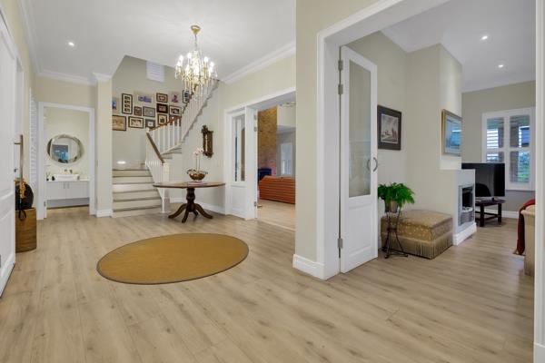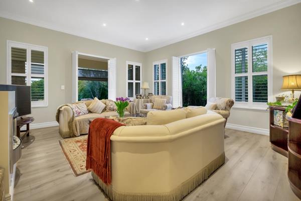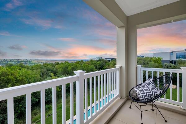 Uniquely positioned on a generous stand with exquisite views and serene surroundings. Step into the grand foyer, where soaring ceilings adorned with intricate mouldings greet you with expansive living spaces bathed in natural light. The gourmet kitchen is a culinary haven, featuring state-of-the-art built-in SMEG appliances which include gas and electric ovens, a separate scullery/kitchen with pantry, additional fridge and gas HOB. Adjacent is the formal dining open plan living area with double sided fireplace for both sitting and dining areas, which is where memories are crafted over sumptuous feasts and lively conversations flowing onto the entertainment patio complete with roll-down sun blinds and a built-in gas braai providing a serene backdrop for relaxation and enjoyment in the patio equipped with two bar fridges. Step further outside to discover an oasis of leisure, with a sparkling 12 m lap pool and meticulously landscaped gardens with direct access to the green belt, unobstructed views and walking trails. Furthermore downstairs offers a separate formal lounge/living room and an en-suite guest bedroom. Retreat to the master suite, a haven of tranquillity boasting a walk-through dresser, a spa-inspired ensuite bath with a soaking Victoria and Alfred tub, and a separate toilet. Exquisite views from the master suite over Steyn City are enjoyed with a private balcony - amazing views out towards Lanseria and the Magaliesberg, and beautiful sunsets daily. The three additional upstairs bedrooms offer unique charm, air conditioning, heating and ensuite bathrooms ensuring comfort and privacy for family and guests alike. Downstairs guest room opens up onto the garden. All with north-facing windows, rain shower heads and Grohe fittings from Germany. Other notable features of this stunning property include 50 000l rain tank with a UV filtration system for water outages, a garden, four garages, en-suite staff quarters, a work-from-home office which can be converted into a 6th bedroom, a solar system, solar geysers, battery backup power and double glazing which contributes to the efficiency and insulation. This home is solar-ready with an inverter and battery backup for load shedding, including a backup water and purification system.