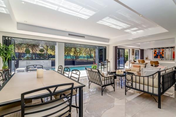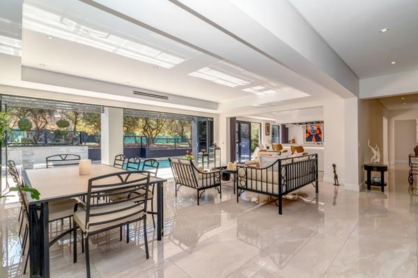 An elegant built-in bar complements the formal lounge and dining area, creating a refined environment for hosting. Walls of floor-to-ceiling aluminium stacking doors dissolve the boundary between indoors and out, revealing a private outdoor sanctuary featuring an oversized sparkling pool, multiple relaxation zones, and a beautifully curated alfresco dining terraceideal for unforgettable evenings with family and friends.