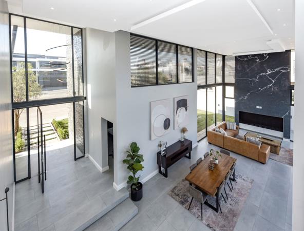 Experience the epitome of luxury in this modern contemporary 4-bedroom, 4-bathroom home in Steyn City, showcasing the architectural excellence expected from high-end residences. Flooded with natural light, this home offers a harmonious blend of style and functionality. The ground floor features an en suite 4th bedroom, a study, and an expansive open-plan living area, seamlessly integrating a fully equipped kitchen with Caesarstone countertops, gas hob, built-in ovens, fridge, and a separate scullery.