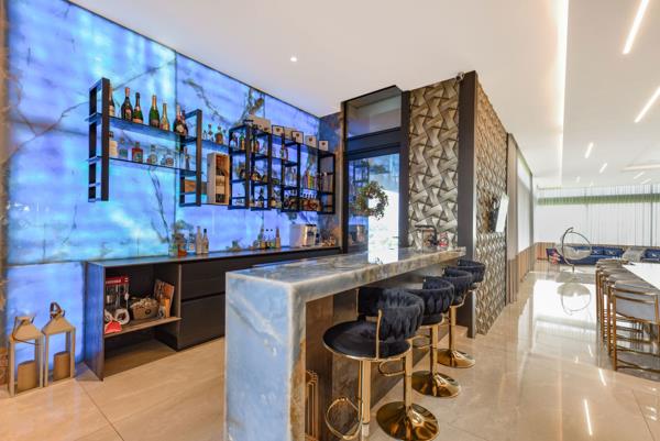 The homes four-car garage rivals a luxury car showroom, outfitted with LED lighting and fully automated doors. The private home gym is also integrated with smart controls, ensuring every workout is personalised and perfectly lit. Entertain with distinction at the onyx wall bar, complete with customisable lighting, or in the lavish 9-seater cinema featuring an ultra-wide screen and tailored seats with personal keypads, providing an unparalleled cinematic experience in the comfort of your home.