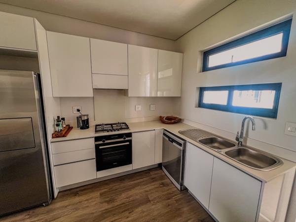 Gorgeous Apartment with Sleek Features . Experience contemporary living in this 96 sqm apartment, thoughtfully designed for comfort and style. The home boasts sleek vinyl flooring, double-glazed windows, and air conditioning in the main bedroom and living area. The modern kitchen is a chefs delight, featuring a gas stove, electric oven, Caesarstone countertops, and a convenient food waste disposal system. Enjoy the ease of prepaid utilities and the connectivity of a fibre-ready setup. With a backup generator ensuring uninterrupted power during loadshedding, your lifestyle remains seamless. A small dog is welcome, subject to approval, making this a pet-friendly retreat. Perfectly tailored for discerning residents, this property blends functionality with refined living.