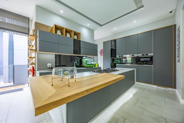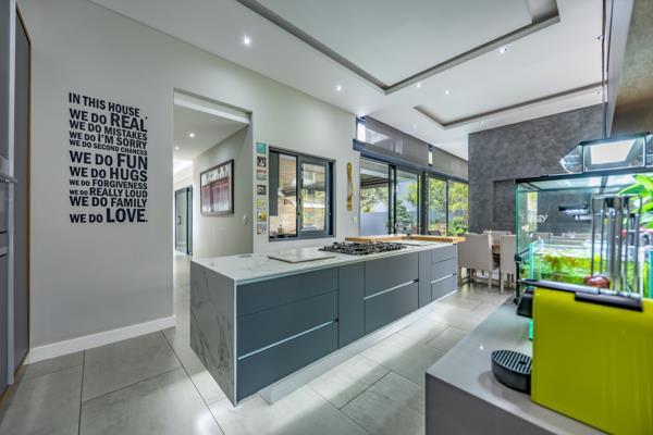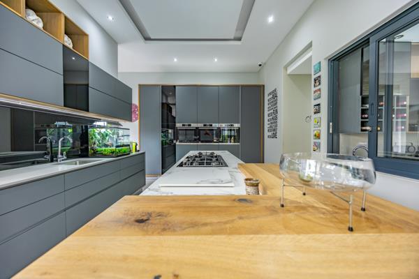 The heart of this home is its sleek, modern kitchen, equipped with integrated appliances, dark grey cabinetry, and elegant marble-look countertops. A prominent island with a gas hob serves as a focal point, complemented by a practical pantry and a unique built-in aquarium. The seamless flow extends to the outdoor entertainment area, featuring a private swimming pool, a well-maintained garden, a patio, and a built-in braai, perfect for al fresco dining and enjoying the scenic views.
