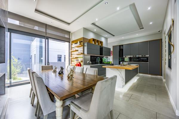 Discover an exceptional residential offering within the prestigious Steyn City, Midrand, South Africa. This meticulously designed property, spanning a generous 326.00 sqm on a 652.00 sqm erf, epitomises contemporary estate living. The residence features an expansive open-plan layout, seamlessly integrating the lounge and two distinct dining areas, all bathed in abundant natural light from extensive floor-to-ceiling windows and sliding glass doors. Modern finishes, high ceilings, recessed lighting, and air conditioning enhance the sophisticated ambiance, creating an ideal environment for both relaxation and entertaining.