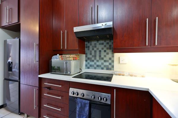 Discover this modern 2-bedroom, 2-bathroom apartment, offering 98 sqm of comfortable living within a well-maintained security complex in Sunninghill, Sandton. The attractive exterior features a blend of red brick and light walls, complemented by terracotta roof tiles, lush palm trees, and a sparkling communal swimming pool. This inviting environment sets the stage for a desirable suburban lifestyle.