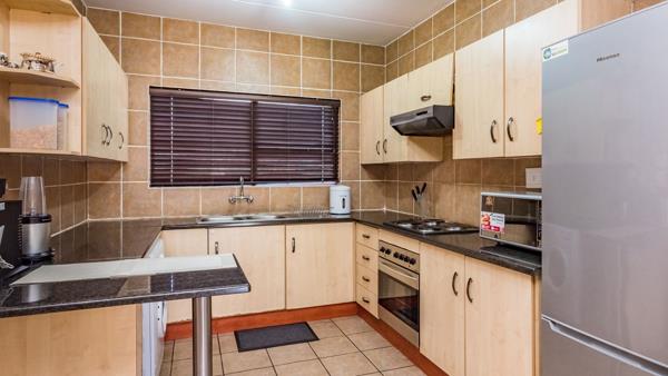The two bedrooms are impressively sized, each fitted with ample built-in cupboards. The master bedroom boasts a luxurious full en-suite bathroom, while the second bedroom is served by a well-appointed additional bathroom. As an added bonus, the unit is equipped with an Inverter System, ensuring uninterrupted power during load-shedding.
