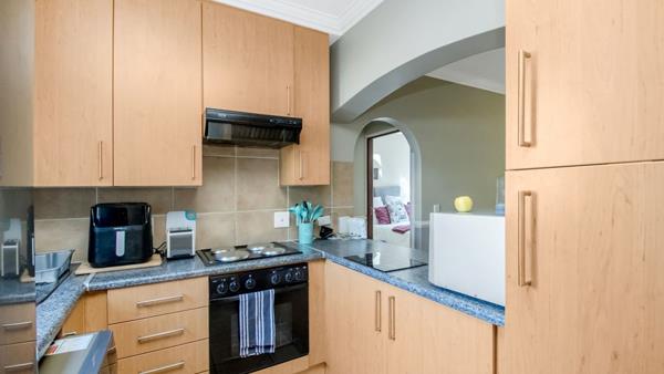 The open-plan living and dining area flows seamlessly onto a generous, covered patio, ideal for entertaining or relaxing while overlooking your tranquil garden. The well-appointed kitchen offers ample cupboard space and room for one wet appliance.