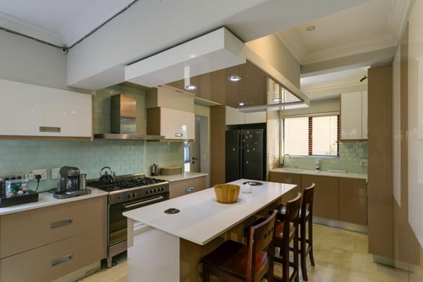 The contemporary kitchen is thoughtfully equipped with a gas stove, accommodates a double-door refrigerator, and includes space for three under-counter appliances. Additionally, it features a pantry and a scullery for added convenience. A dedicated bar area is perfect for those who enjoy entertaining guests in style.
