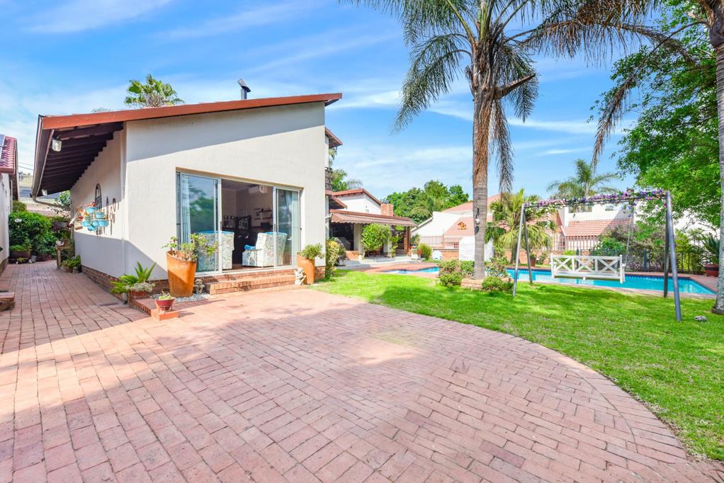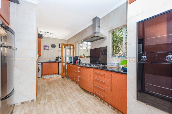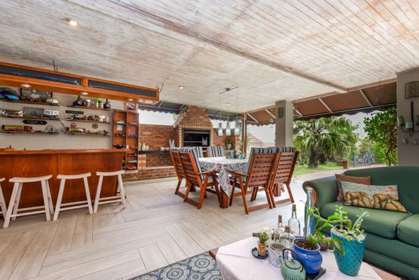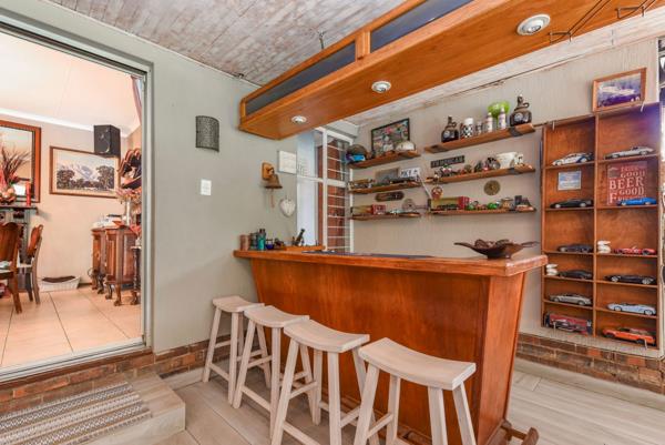 The heart of the property is its entertainers patio, complete with a fitted bar and built-in braai a space designed for gathering with friends and family while overlooking the sparkling pool and lush, established garden. The kitchen boasts a gas hob and double door fridge space with the scullery offering room for 3 appliances and a bar fridge.