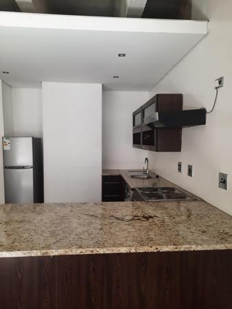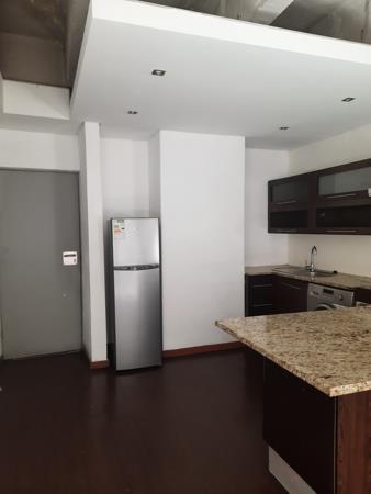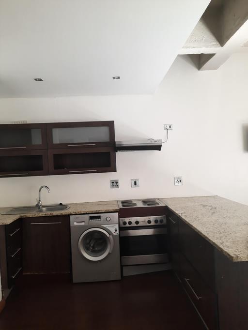 The apartment opens up to an open plan kitchen. The large adjacent living area with built-in cupboards has floor to ceiling windows and a sliding door.