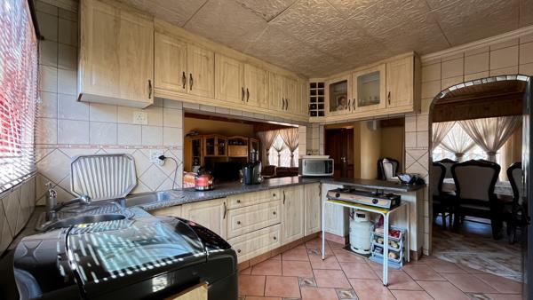 The interior layout features an open-plan design, seamlessly connecting the lounge, dining area, and kitchen. The lounge is appointed with a functional fireplace, contributing to a comfortable atmosphere, while large windows ensure ample natural light. The dining room, spacious enough for formal entertaining, also benefits from the ornate wooden ceiling. The kitchen is equipped with extensive cabinetry, a built-in oven with an electric hob, an additional countertop gas hob for culinary flexibility, and dedicated space for a washing machine, catering to practical needs.