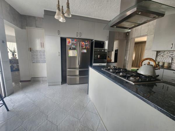 The ground floor of the residence features an expansive and luminous lounge that leads to a sizable balcony, alongside a modern kitchen that connects to a spacious dining area. The kitchen has undergone recent renovations, showcasing contemporary design elements such as elegant grey granite countertops, white tiled surfaces, ample cupboard storage, and a generously proportioned patio. Additionally, an established backyard with a tidy garden provides an ideal space for recreational activities.