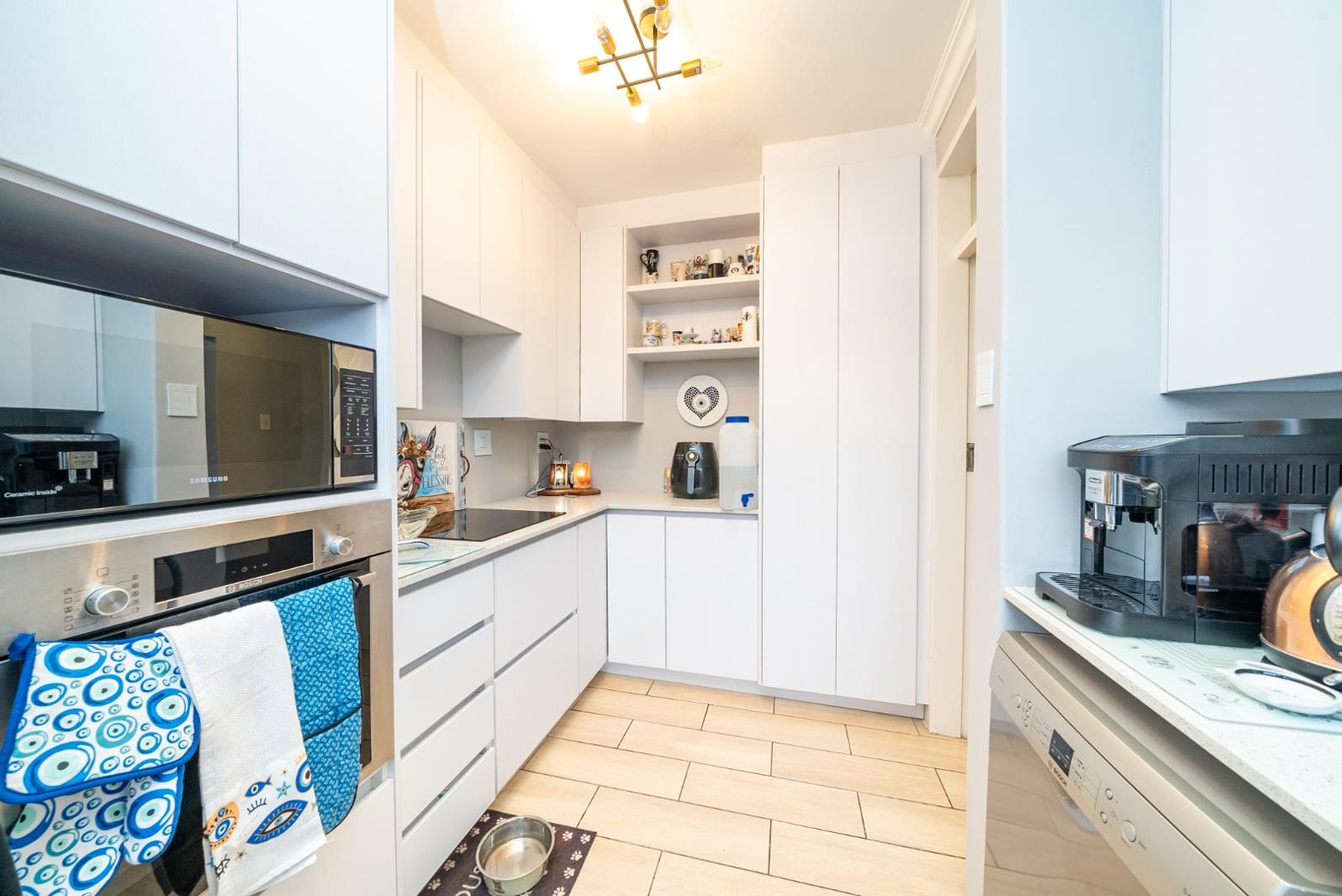 The spacious lounge and dining area flow seamlessly into a modern kitchen featuring ample storage, and elegant countertops. The three well-sized bedrooms offer built-in cupboards, with the master suite enjoying a private en-suite bathroom.