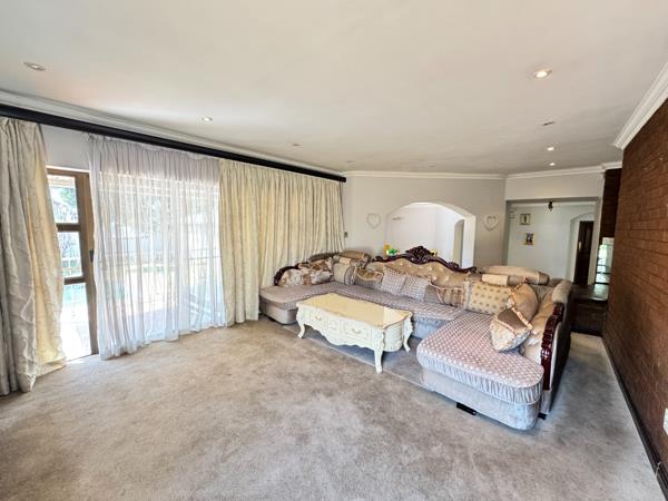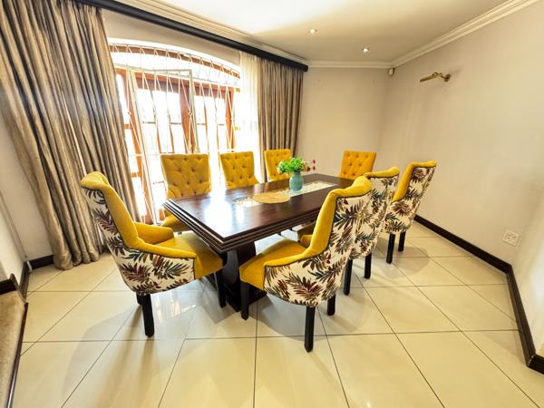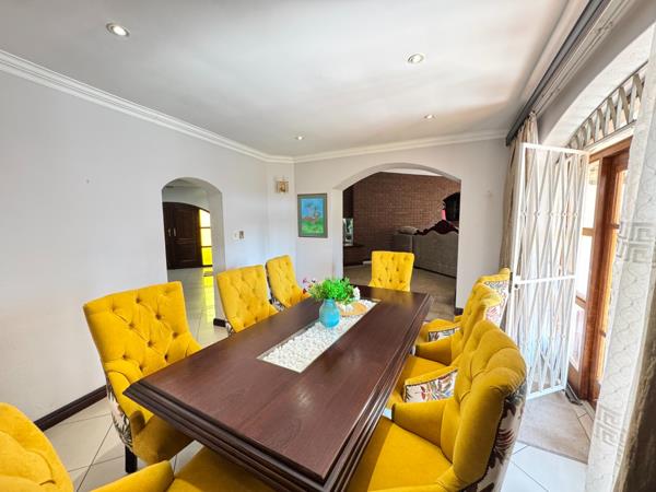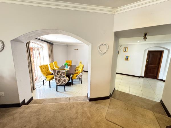 Entertainers dream, a built-in bar, an 8-seater dining room that also opens to the patio, and a view of the sparkling swimming pool, elevated entertainment area, and expansive garden with a Lapa and built-in braai, perfect for creating family memories.