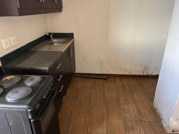 This low maintenance bachelor studio offers open plan living areas with a kitchen area. The kitchen offers cupboards space with a stove and basin. A breakfast bar separates the kitchen from the living area. The whole floor area has laminated flooring. There is a separate bathroom with toilet, bath and wash hand basin.