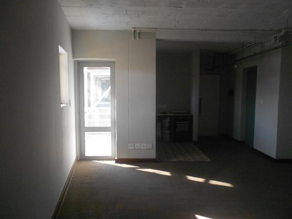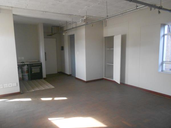 Spanning 59 square meters, the apartment presents an open-plan layout designed for flexible living. Natural light floods the space through generous windows, illuminating neutral walls and classic parquet flooring. The functional kitchenette includes a stove, complemented by built-in cupboards for practical storage solutions. An industrial-style exposed ceiling adds a touch of modern character to the interior.