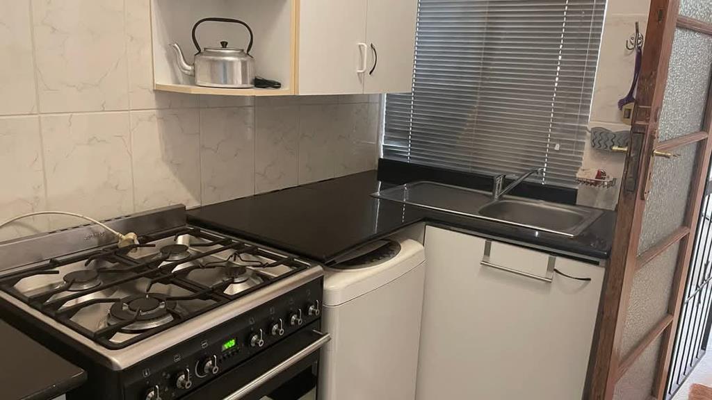 The kitchen is well laid out with gas stove and fitted cupboards.