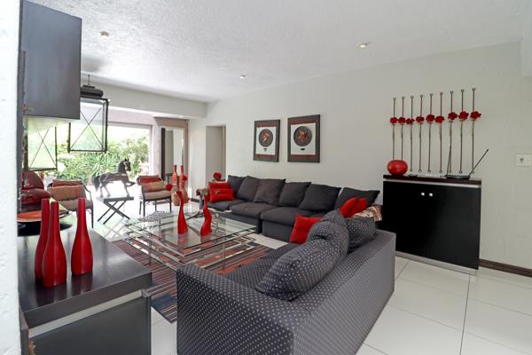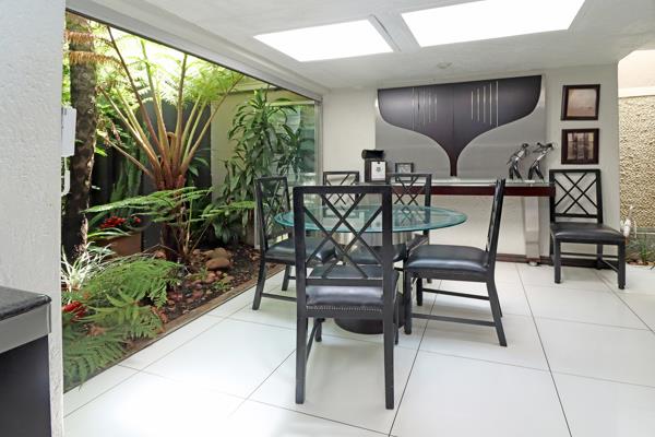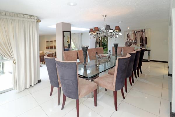 Multiple Living Areas consist of 2 Elegant lounges and a spacious dining room, all overlooking a lush, tropical garden. Exquisite Entertainers Patio. An expansive, covered space with a built-in server, cupboards, and braai, offering the perfect setting for gatherings while overlooking the sparkling pool and tropical garden.